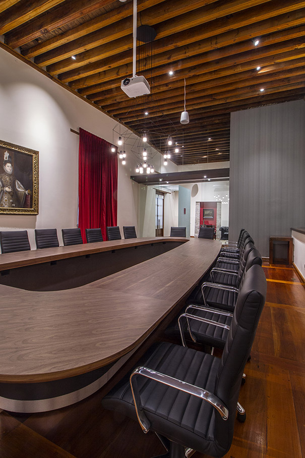 El área de la sala de reuniones debía ser espectacular, se diseñó una gran mesa en forma de bala con acceso al centro para que el orador pueda estar cerca de todos los presentes o bien se puede cerrar y tener una mesa para 25 personas. Sobre esta se colocó un gran candil de diseño contemporáneo, se maximizó el uso del rojo —el color corporativo— para dar los acentos al espacio y se incorporó el uso de los equipos necesarios para brindar toda la comodidad para llevar a cabo una reunión o evento. El arte seleccionado aporta la personalidad del espacio, por lo que ningún otro elemento debía competir con él.