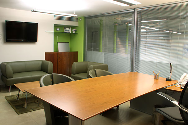 En las áreas operativas el trabajo individual y en equipo, marcó la selección de los elementos que resultó en espacios agradables visualmente pero muy eficientes, con una agradable combinación de colores base y de acento. En el área privada de los socios se consideraron tanto las actividades diarias como las de relajación, para lo que se hizo una ligera división entre la sala de consejo y la sala TV-bar mediante una puerta corrediza de cristal.