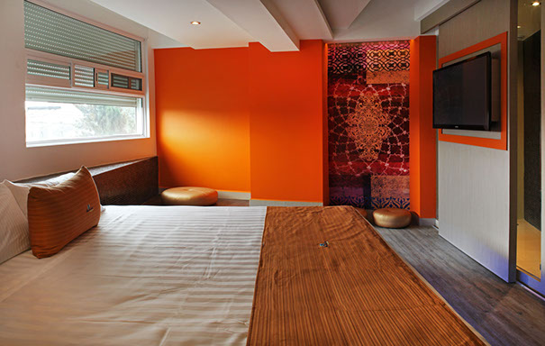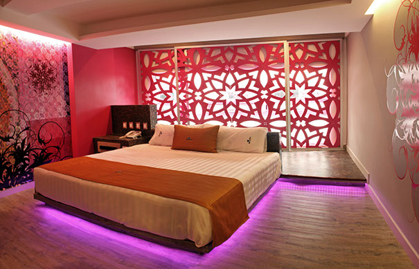 En algunas habitaciones se colocó una celosía iluminada atrás de la cama que genera un atractivo juego de luz, sombra y color. La combinación de elementos glorifica el misterio de la vida y la muerte, el tiempo y la eternidad que son tan importantes para la cultura India.