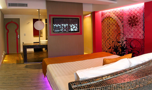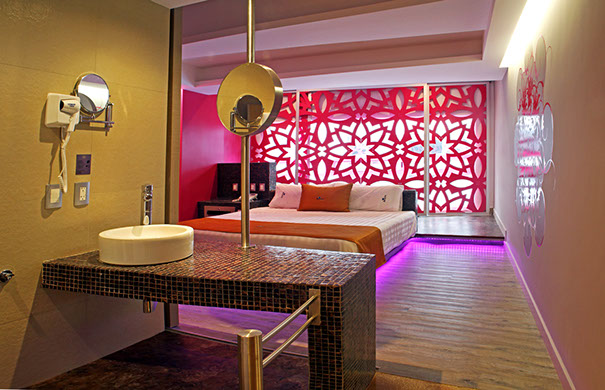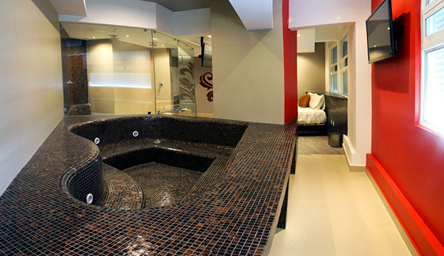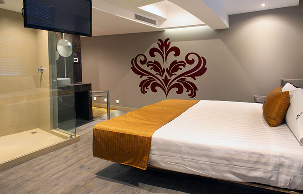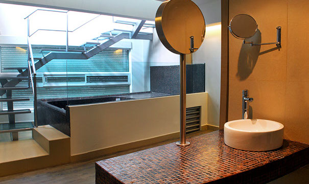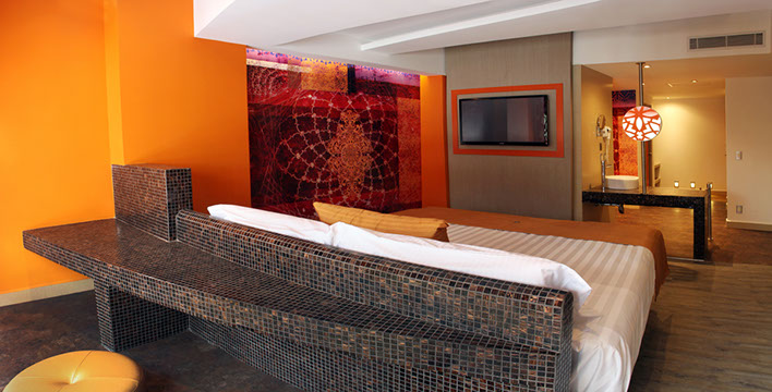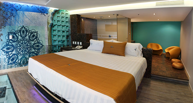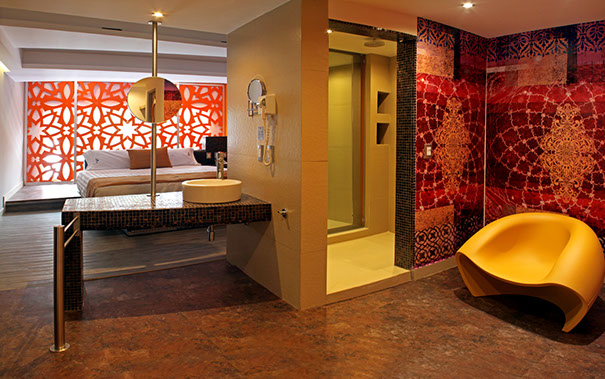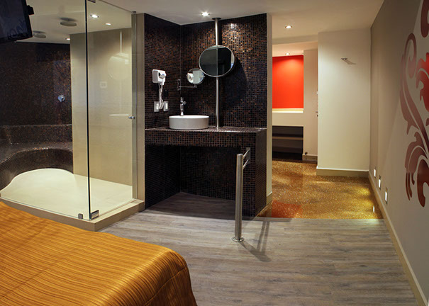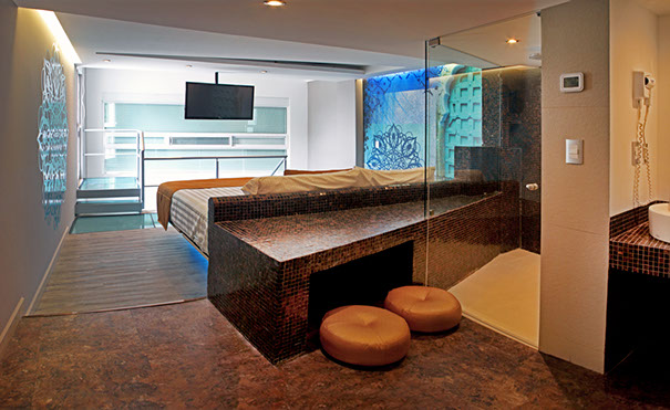 La regadera es un elemento que destaca en cada una de las habitaciones que logra una separación de ambientes junto con el muro de televisión y el espejo, destacando o minimizando su presencia. Las suites cuentan con jacuzzi para hacer más agradable la estancia de los huéspedes.