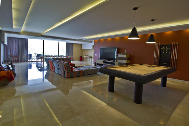 La familia y los amigos son el centro de las áreas públicas y privadas, en las que se puede apreciar la intención de disfrutar la sala, el comedor, el bar, el área de juegos y el estudio. La armonía que se aprecia entre el mobiliario, materiales y paletas de color le da la personalidad a cada espacio y conforman un lenguaje que se va enriqueciendo en el recorrido.